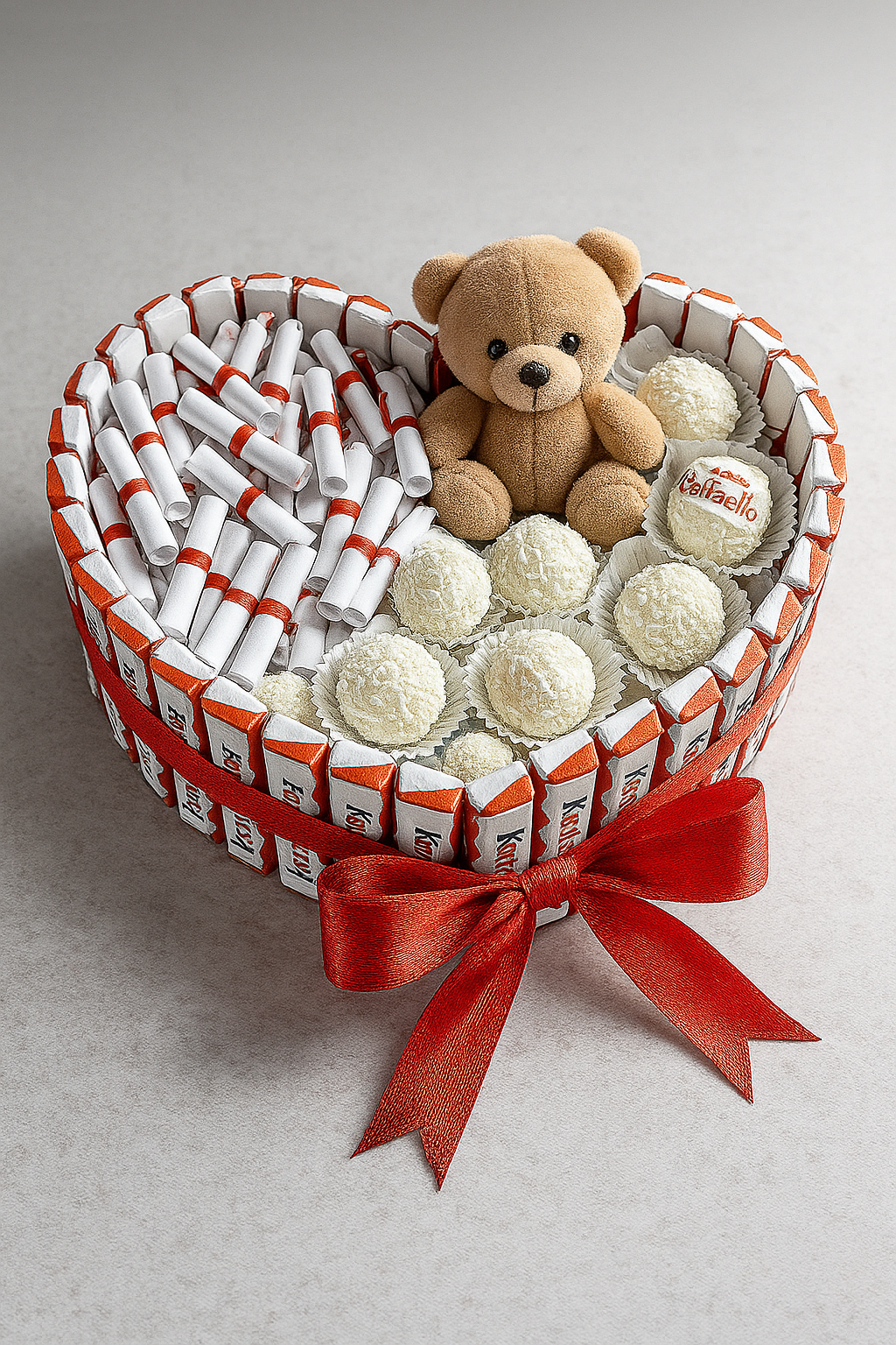 🎀 Ručno aranžiran u obliku srca, ukrašen crvenom satenskom mašnom — ovaj poklon je simbol pažnje, emocije i slatkih uspomena.